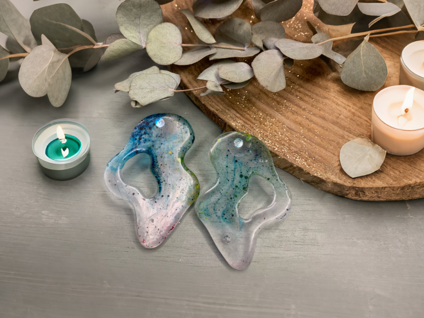 Pendientes grandes de resina con una silueta curva y elegante, característicos por su diseño moderno y fluido. En su interior presentan un sombreado artesanal en tonos azul y turquesa, aplicado de forma sutil para crear un efecto acuoso, suave y envolvente. La transición de color dentro de la resina aporta profundidad y un acabado etéreo, manteniendo la pieza ligera y luminosa. Cada pendiente es único gracias a su trabajo manual, ideal para quienes buscan un accesorio delicado, artístico y con inspiración marina.