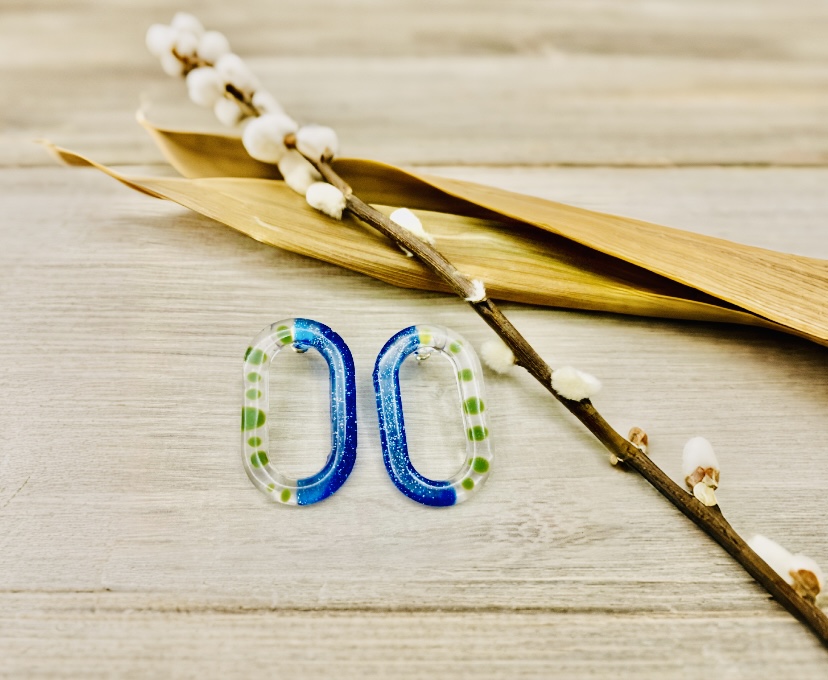 Estos pendientes de resina combinan originalidad y elegancia en una sola pieza. Su diseño circular, con mitad azul con purpurina y mitad transparente con motas verdes, crea un efecto luminoso y moderno que resalta con cualquier look.