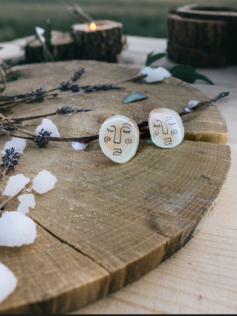 Pendientes circulares de cerámica blanca, pintados a mano en ambas piezas (con caras)para ofrecer un diseño completo y detallado desde cualquier ángulo. Cada pieza está recubierta con resina transparente que aporta brillo, protege el acabado artesanal y realza los colores. Su estilo único y versátil los convierte en un accesorio elegante, original y perfecto para quienes buscan detalles artesanales con personalidad.
