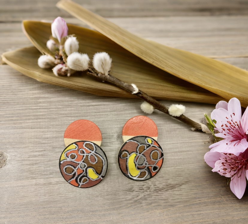 Estos pendientes están hechos sobre base de madera con un diseño abstracto que combina formas orgánicas y modernas, utilizando tonos salmón suaves como base. Cada pieza está cuidadosamente pintada a mano, convirtiéndola en un accesorio único, original y lleno de estilo.