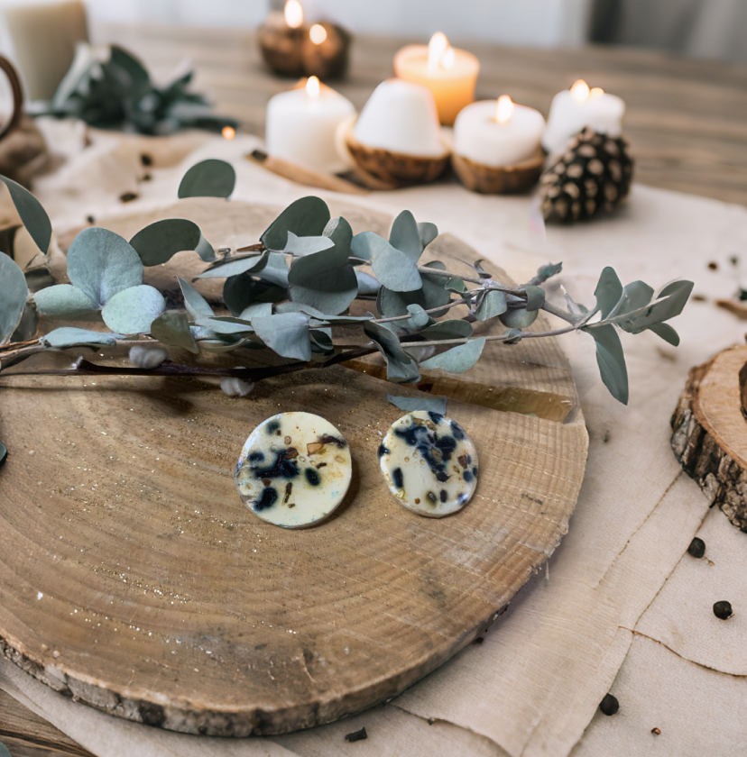 Pendientes grandes y redondos elaborados en cerámica blanca, incorporando delicadas infusiones que aportan matices naturales y un toque orgánico al diseño. Cada pieza está recubierta con una capa de resina transparente que resalta los colores y texturas, aporta brillo y protege la superficie. Su acabado artesanal y su estilo llamativo los convierten en un accesorio único, ideal para quienes buscan un toque natural y elegante en su look.
