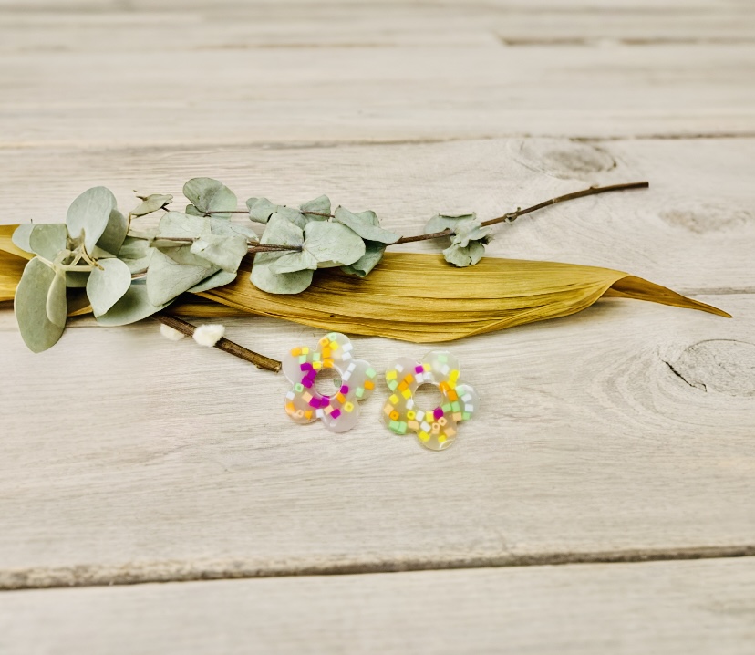 Estos pendientes tienen forma de flor y están hechos en resina transparente, pero lo que los hace realmente especiales es que están llenos de cuentas de cristal de colores, creando un efecto divertido, alegre y lleno de brillo con cada movimiento.