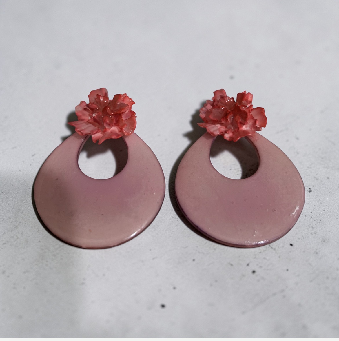Pendientes artesanales en tono rosa empolvado con detalle de flor en relieve. Su diseño combina una flor central en tonos coral y rosa con una pieza colgante geométrica ligera, creando un estilo femenino, elegante y muy original.