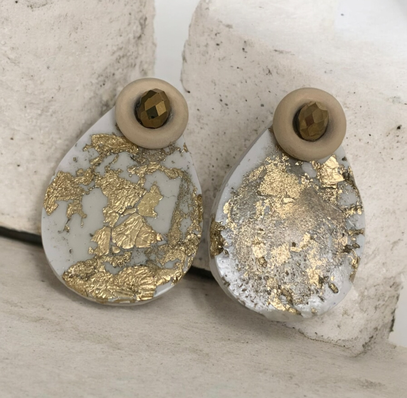 Pendientes de resina en forma de lágrima con elegante efecto mármol en color blanco y delicados toques dorados, que aportan sofisticación y luminosidad. La parte superior cuenta con un detalle de madera y una pequeña cuenta dorada, combinando calidez natural con un acabado moderno y brillante.
