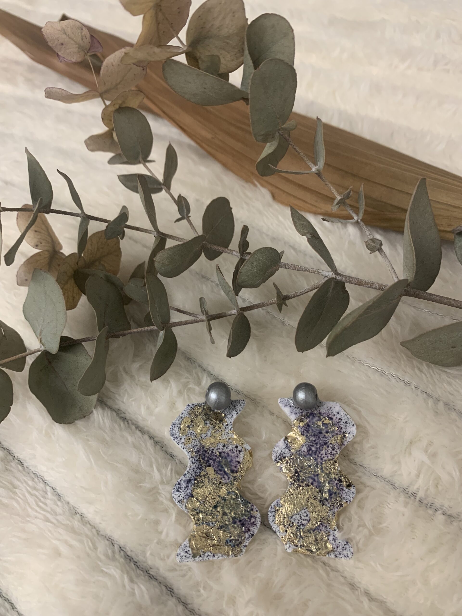 Pendientes colgantes de diseño fluido y contemporáneo, realizados en efecto mármol con una silueta de curvas suaves que aporta movimiento y originalidad. El diseño prescinde de pieza superior, integrando directamente un delicado detalle de bola de madera en color plata que añade contraste y un toque sofisticado. Ligeros y versátiles.
