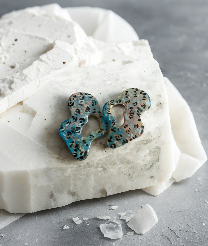 Pendientes artesanales de gran tamaño con curvas simétricas, pintados a mano con un elegante estampado animal print en tonos azul. Su diseño combina estilo y resistencia gracias a la innovadora composición de resina y granos de arroz, que aporta durabilidad, firmeza y ligereza al mismo tiempo. Cada pieza está cuidadosamente trabajada para resaltar la textura y el color, haciendo de estos pendientes un accesorio único, moderno y duradero, perfecto para quienes buscan un toque atrevido y sofisticado en su look.