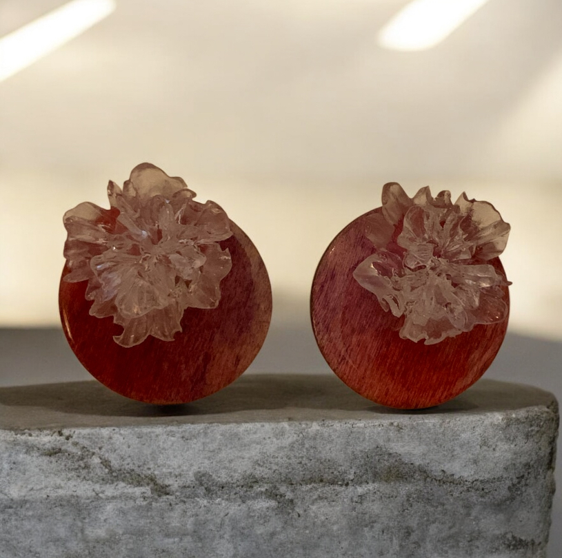 Pendientes artesanales elaborados en madera pintada a mano, cuidadosamente cubiertos con resina para un acabado brillante y duradero. Presentan un delicado detalle floral irregular, que aporta textura, luz y un carácter único.