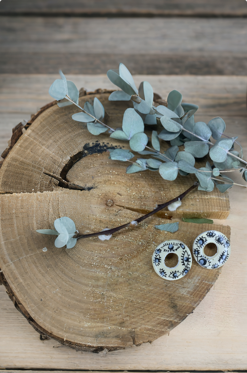 Pendientes con forma de dónut elaborados en cerámica y pintados a mano con múltiples ojos, creando un diseño llamativo y original. Cada pieza está recubierta con resina transparente que realza los colores, aporta brillo y protege el acabado artesanal. Su estilo único y detallado los convierte en un accesorio divertido, contemporáneo y lleno de personalidad, ideal para quienes buscan un toque artístico y atrevido en su look.