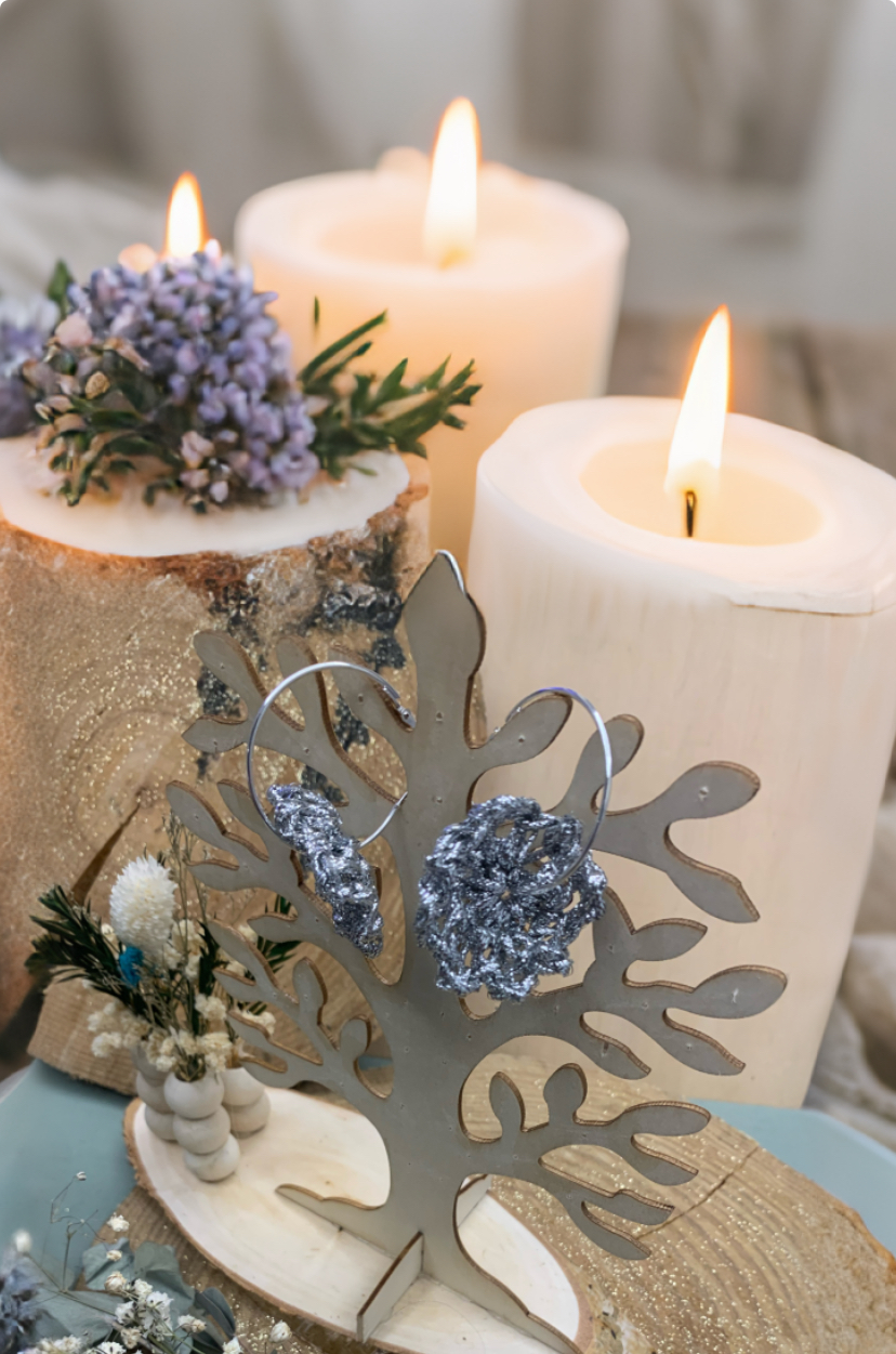 Pendientes de aro con delicada flor tejida en color plata. Ligero y elegante, combina textura y forma floral .