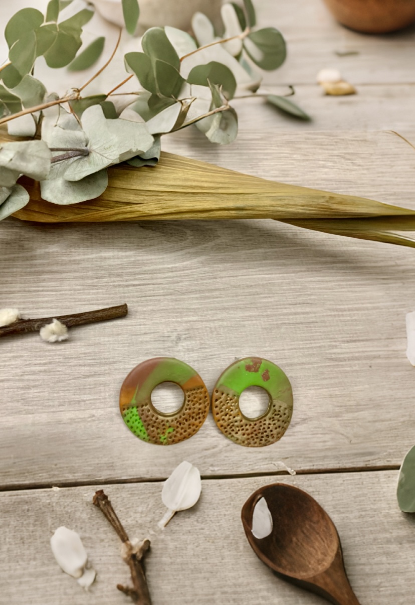 Estos pendientes están hechos a mano con arcilla polimérica y presentan un acabado texturizado, que les aporta profundidad y carácter. Los detalles pintados a mano realzan los tonos verde Kali, creando un diseño original, elegante y con mucha personalidad.