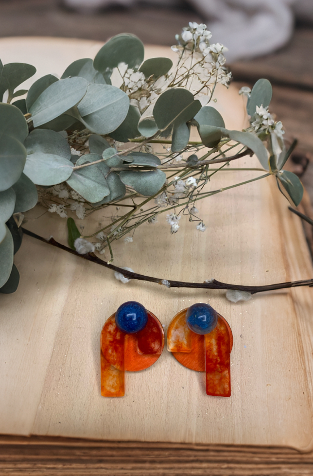 Pendientes únicos que combinan una base circular de madera con dos piezas de resina en rojo y azul. Ligeros, cómodos y audaces, perfectos para añadir un toque de color y originalidad a tu estilo.