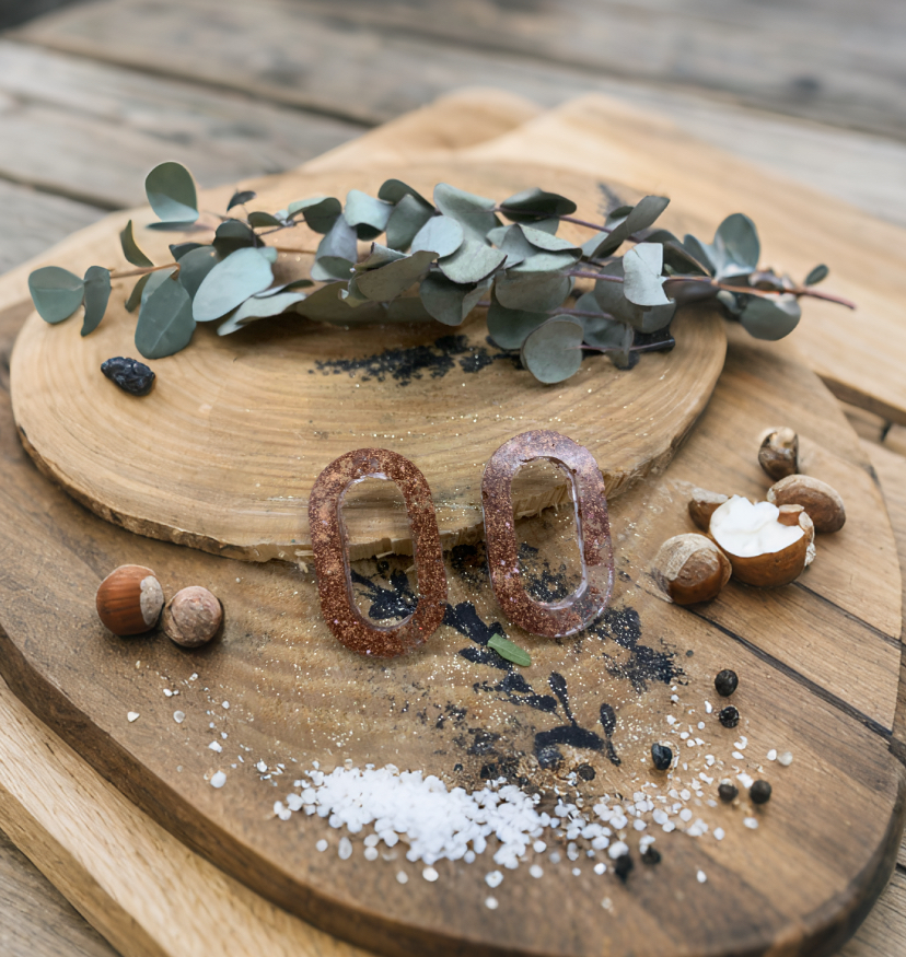 Pendientes de resina en forma ovalada, transparentes con cálido tono marrón cobrizo.