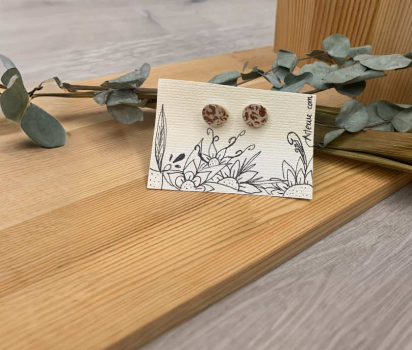 Los pendientes Tierra Viva están elaborados a mano en resina, con un acabado marmoleado en tonos cálidos que evocan la textura de la arcilla y la tierra.