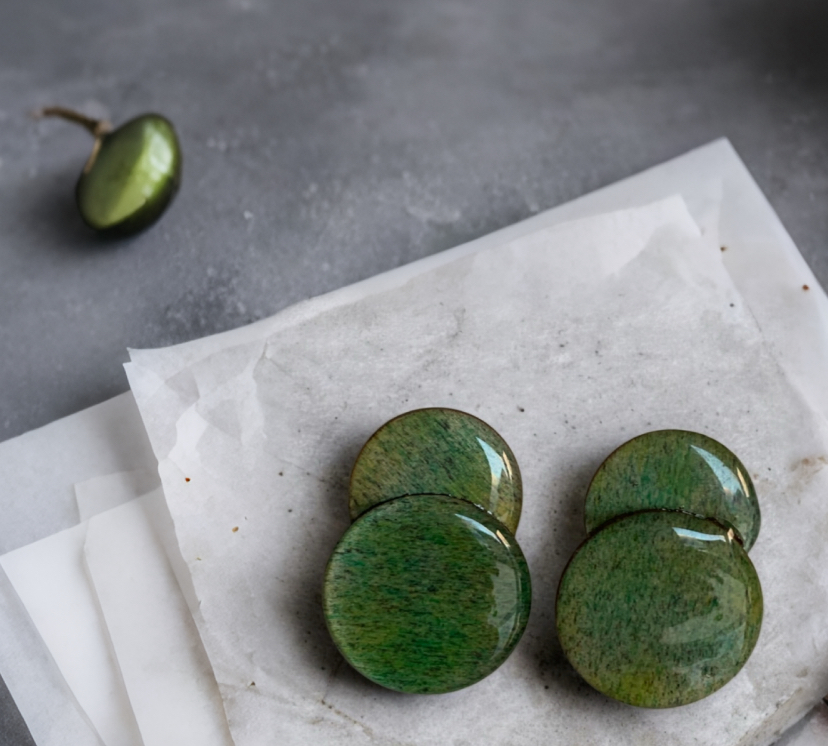 Pendientes artesanales elaborados en madera, pintados a mano en delicados tonos verdes inspirados en la naturaleza. Cada pieza está cuidadosamente cubierta con una capa de resina transparente que aporta brillo, profundidad y protección, resaltando las vetas y matices únicos del color.